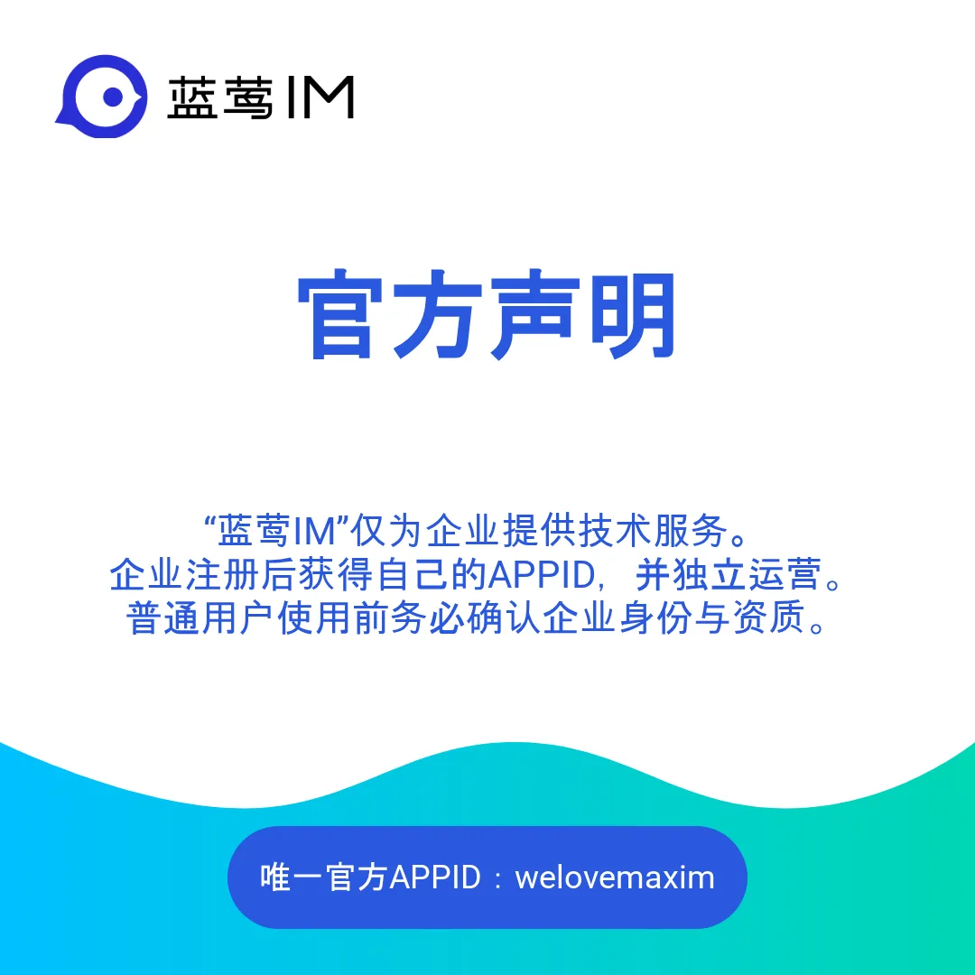 登录或使用APP时,请务必留意界面显示的“服务提供方”信息,确认其对应企业名称。凡APPID非 welovemaxim的,均属客户企业运营,非“蓝莺IM”平台本身。使用前确保沟通业务符合企业身份与资质。